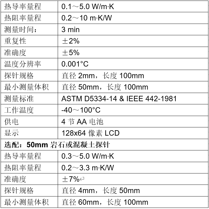 50 mm長度的探針傳感器作為可選件,用于測量較硬的物質,如巖石和混凝土。測量時,需要先在樣品中鉆一個直徑4 mm、長度50 mm的圓孔,并使用潤滑劑以保證傳感器與樣品之間充分接觸。